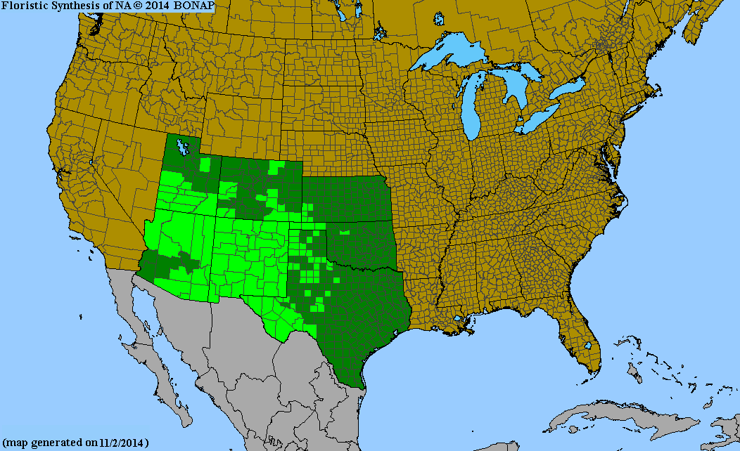 Life zones and habitat: Plains and foothills (3500 to 6500 ft.); dry soils on plains, hillsides, mesas, and along washes.