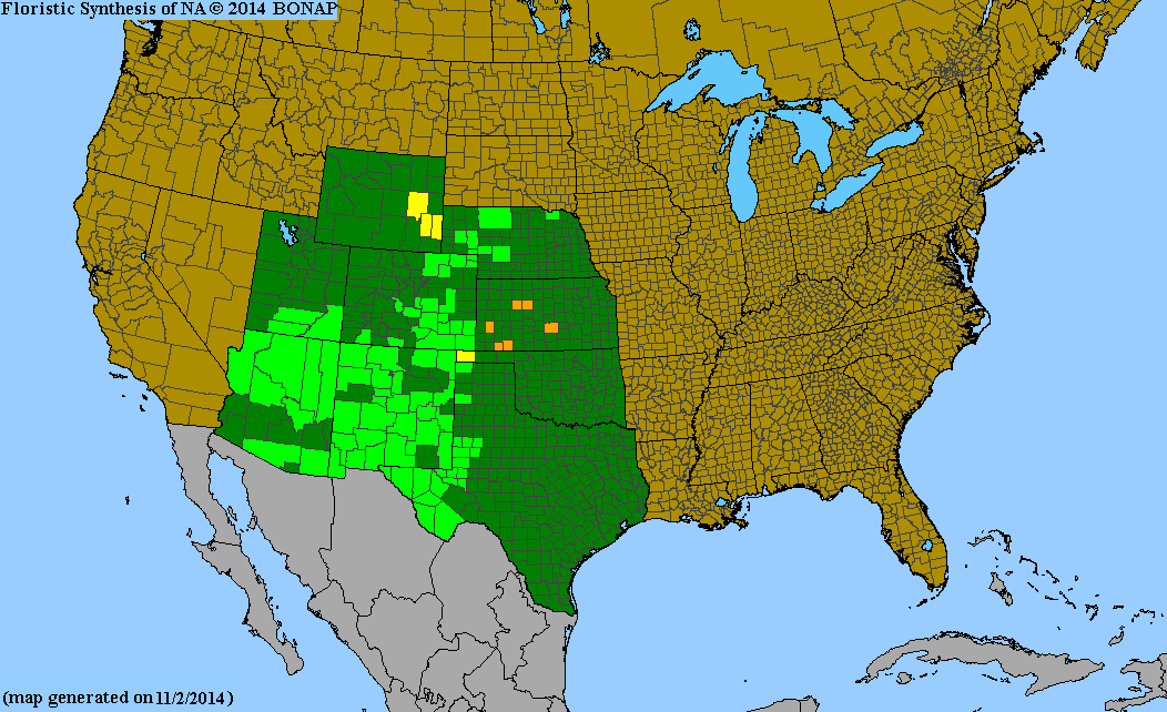 | Description | Life zones and habitat: Plains and foothills (3500 to 7800 ft.); dry, gravelly or sandy locations in open areas of brushlands, rocky ledges, slopes and canyons, isolated or frequently in very large colonies. Plant: Sprawling or upright, low-growing annual 4 to 8 inches tall; much-branched stems. Leaves: Very narrow linear leaves, 3/8 to 1-5/8 inches long and less than 1/8-inch wide, crowded near ends of stems; opposite and sessile; surfaces have oil glands producing lemon scent. Inflorescence: Clusters of a few to several small yellow composite flowers, each about 1/2 inch across with 8 to 10 rays and 10 to 20 disk florets; phyllaries with oil glands at tips. Bloom Period: June to September. References: "Flora of Colorado" by Jennifer Ackerfield, "Wildflowers of Texas" by Geyata Ajilvsgi and Flora of North America. | BONAP Distribution Map  Map Color Key | Colorado Status: Native |
