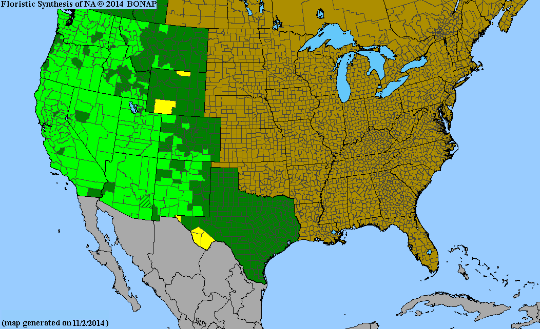 | Description | Life zones and habitat: Plains to montane (4500 to 9000 ft.); moist soils along streamsides, in woodland openings and moist areas within drier, more open areas. Plant: Shrub 6-1/2 to 13 ft. tall with several stems; gray or brown, furrowed bark; stout, angled twigs. Leaves: Deciduous, opposite, pinnately-compound leaves with 5 to 9 leaflets, each 1-1/4 to 5 inches long, lanceolate to elliptic with serrate edges; smooth, green upper surfaces, pale green, smooth or pubescent lower surfaces. Inflorescence: White or cream-colored flowers in a nearly flat-topped compound cyme at tops of stems 2 to 6 inches wide; each blossom 1/8 to 1/4-inch across with 5 petals and stamens; anthers are yellowish. Bloom Period: May to August. Fruit: Clusters of juicy berries, 1/4-inch or less in diameter, bluish-black or purplish-black with whitish coating. References: S. cerulea in "Flora of Colorado" by Jennifer Ackerfield and Burke Herbarium; S. nigra ssp. cerulea in US Forest Service and SEINet | BONAP Distribution Map  Sambucus nigra ssp. caerulea Map Color Key | Colorado Status: Native |