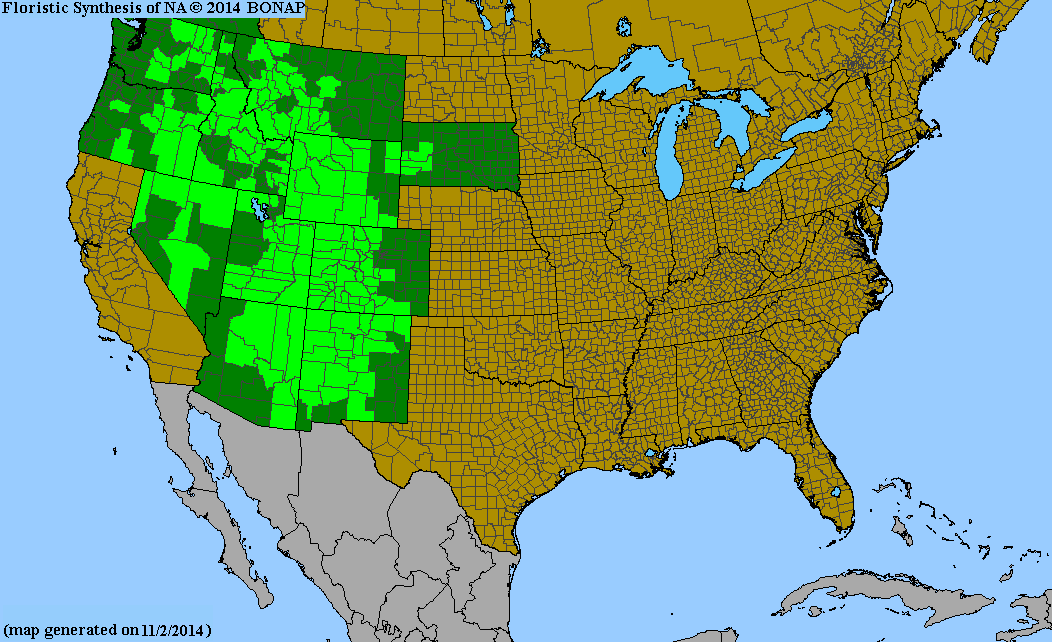 Life zones and habitat: Montane and subalpine (6200 to 12700 ft.); moist areas in meadows, hillsides. Plant: Erect, smooth perennial up to 48 inches tall, depending on conditions. Leaves: Numerous, large basal leaves on short petioles, linear to obovate-shaped up to 6 inches long; smaller opposite stem leaves in 2 to 6 pairs, mostly pinnately-lobed with narrow segments; leaves have hairless surfaces but edges have closely-spaced, extremely small hairs giving a white appearance. Inflorence: Very small greenish-white flowers much less than 1/4-inch across in a compact panicle with opposite branching; flowers are dioecious (separate male and female flowers) or bisexual; lobes/petals rolled up; male blossoms with 3 slightly protruding stamens. Bloom Period: June to August. References: "Flora of Colorado" by Jennifer Ackerfield, EFLORA-BC, Burke Museum-Univ. of Washington and SEINet. |